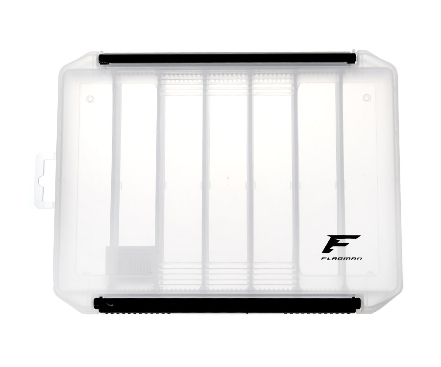 Flagman Tackle Box #5 – містка одностороння коробка, виготовлена з прозорого ударостійкого пластику. Завдяки системі знімних перегородок відмінно підійде для зберігання і транспортування приманок різних типів і розмірів, а також джиг-головок, елементів оснащення та інших аксесуарів. Конструкція дозволяє довільно вибирати розмір та кількість осередків, пересуваючи перегородки з невеликим кроком та ефективно формуючи під себе внутрішній простір коробки. Кришка рибальської коробки Flagman Tackle Box #5 закривається на міцну надійну клямку. Розміри: 24,4 x16, 5x3, 5 см.