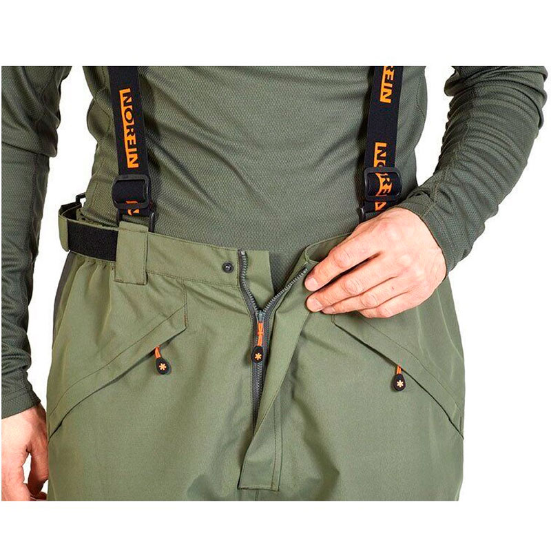Штани оснащені досить широкими еластичними підтяжками із задньою вставкою, яка кріпиться на блискавці для додаткової підтримки попереку. Спереду знаходяться знімні лямки, що регулюються пряжками, і кріпляться на шльовці з липучками. При необхідності підтяжок їх можна легко та швидко відстебнути. Застібка на поясі здійснюється з використанням блискавки тракторної, прихованої під захисною планкою на кнопці.