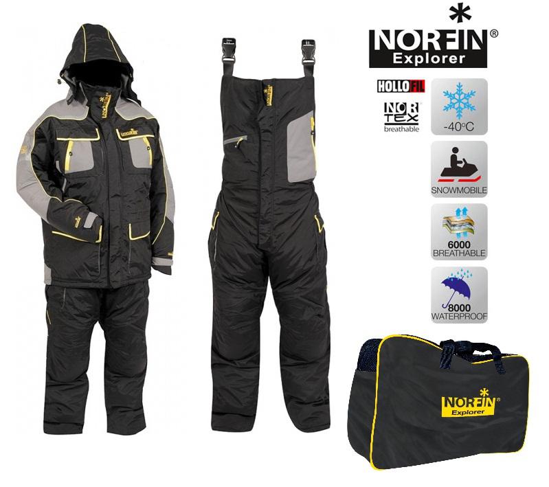 Зимовий костюм Norfin Explorer. Призначений для експлуатації при температурі -40°C. Костюм розроблений як одяг для зимової риболовлі з повною адаптацією для їзди на снігоходах. Мембранна тканина.