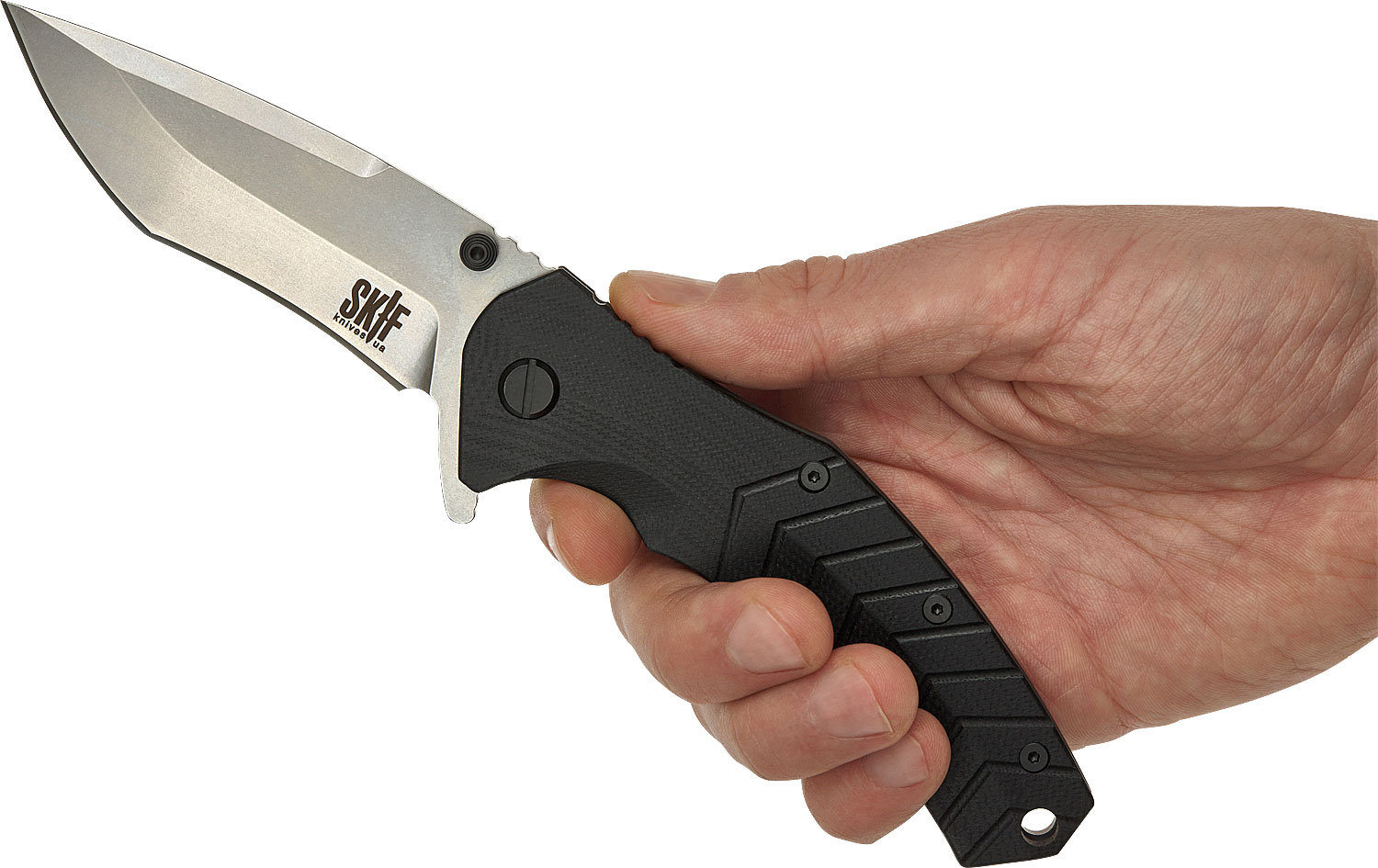 Руків'я, виконане з матеріалу G10, відмінно лежить навіть у вологій руці або рукавичках. Присутня кліпса, яку при необхідності можна зняти та користуватись темляком, під який передбачено отвір.