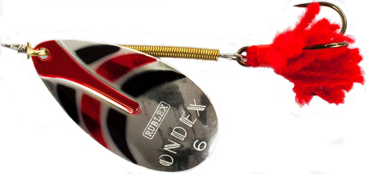 Эта блесна при своем довольно объемном лепестке имеет небольшой вес. Это позволяет рыболову медленно провести блесну в верхних слоях воды, что особенно актуально при ловле в водоемах с заросшим дном и малыми глубинами. Тройной крючок оснащен красной кисточкой-опушкой, которая стабилизирует игру блесны и дополнительно привлекает хищную рыбу. Также Ондекс предусматривает переднюю огрузку разборным грузом-ушастиком. Переднеогруженый Rublex Ondex приобретает совершенно новые возможности и хорошо подходит для джиговой ловли. Случается, что джиговая вертушка пассивный хищник атакует охотнее силикона.