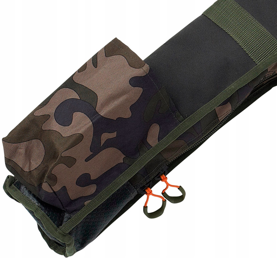 Кроме того каждое отделение для удилища внутри чехла отделено по всей длине мягкой перегородкой, которая препятствует соприкосновению удилищ. По всей длине чехол закрывается на прочную HD молнию с надежным и долговечным замком Hi-Viz. На внешней стороне чехла имеются карманы и крепежные ремни с застежками для фиксации дополнительных аксессуаров, таких как подсака, зонт и тому подобных.