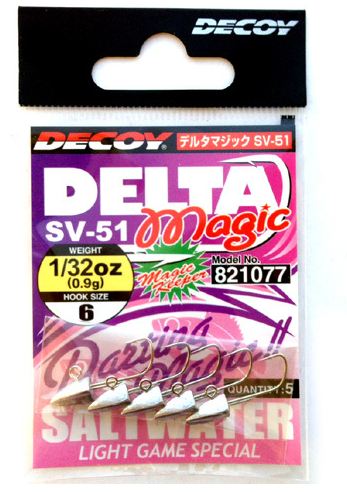 Decoy SV-51 - ультралайтовая джиг-головка с необычайно острым крючком Decoy и системой удержания приманки "magic". Головки очень хороши в тандеме с червячной приманкой и отлично подходят как при ловле окуня, щуки и форели, так и для морского"рокфишинга". Особая форма грузила позволяет приманке планировать в толще воды, благодаря чему можно добиться необычной игры приманки на рывковых проводках. Также возможно применение SV-51 при ловле в отвес, как с лодки, так и со льда.