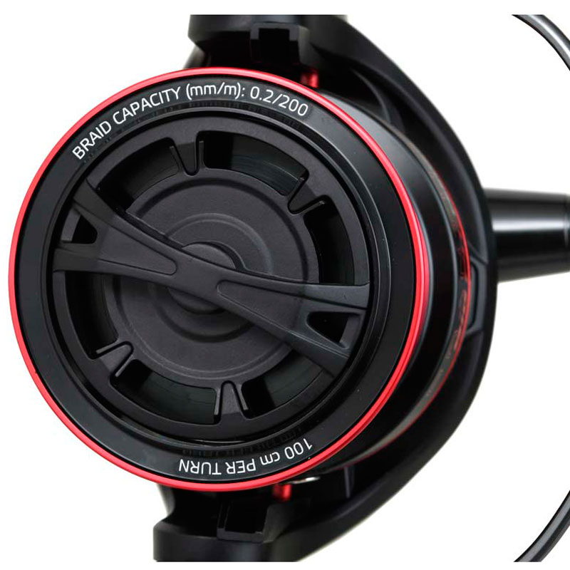 Чтобы сделать конструкцию легче, юбка шпули укорочена, а под шпулей расположено специальное кольцо, выступы которого входят в пазы на внутренней поверхности ротора. Это предотвращает попадание лески под шпулю и ее наматывание на ось.
