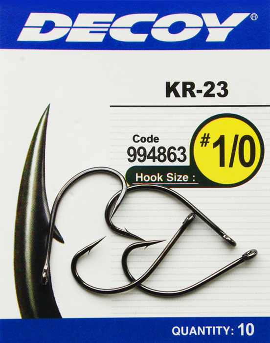 Крючок Decoy KR-23 имеет удлинённое цевьё и изготовлен из проволоки увеличенного диаметра. Длинное тонкое жало легко вонзается в рыбьи губы, а особая форма изгиба распределяет нагрузку, возникающую при вываживании крупной рыбы так, что разгибание крючка сводится к нулю.