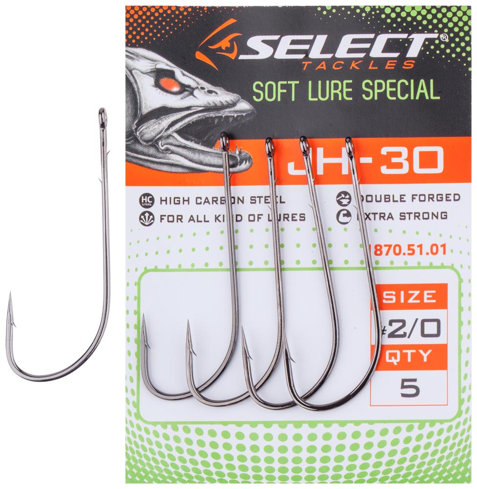 Select JH-30 применяется для оснащения любых, не очень объемных силиконовых приманок – червей, твистеров и слагов. Крупный одинарник лучше засекает рыбу в сравнении с офсетными крючками. При этом на много легче избегает зацепов за подводные препятствия, чем двойные и тройные крючки.