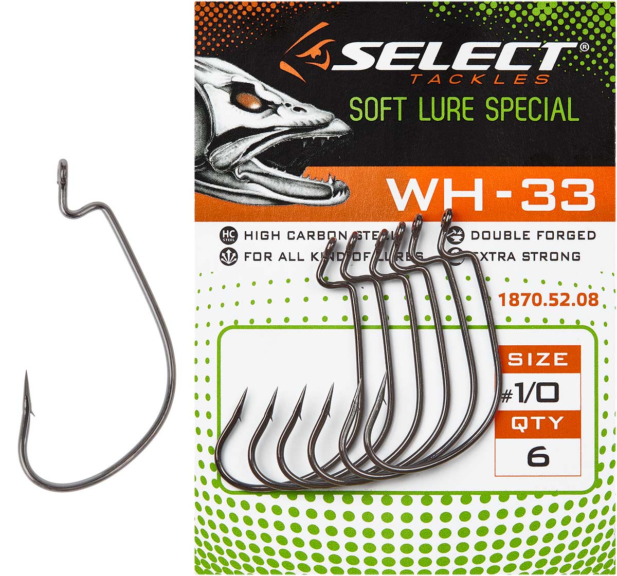 Крючок Select WH-33 – серия оффсетных крючков с широким изгибом и жалом, направленным внутрь. Такая форма оптимальна для приманок имеющих короткое тело, таких как твистера и небольшие виброхвосты. При этом жало прижимается к силикону и уменьшается вероятность зацепа за препятствия. Крючки выполнены из высокоуглеродистой стали с использованием лазерной заточки жала, что делает их острыми и прочными. Крючок Select WH-33 используется для ловли щуки, окуня, судака и другой хищной рыбы наших водоёмов.