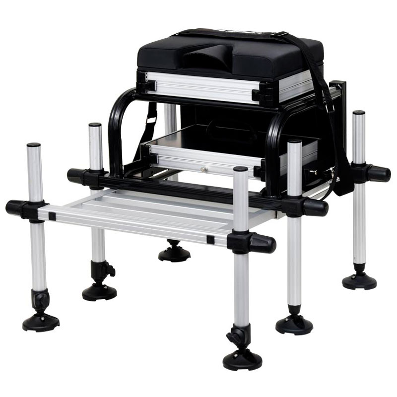 Она основана на мощной сварной раме из алюминиевых труб. К основной раме крепится модуль с ящиком, сидением и выдвижным ящиком (выдвигается в сторону), а также дополнительный съемный выдвижной модуль, который может быть расширен дополнительными модулями, приобретаемыми отдельно.