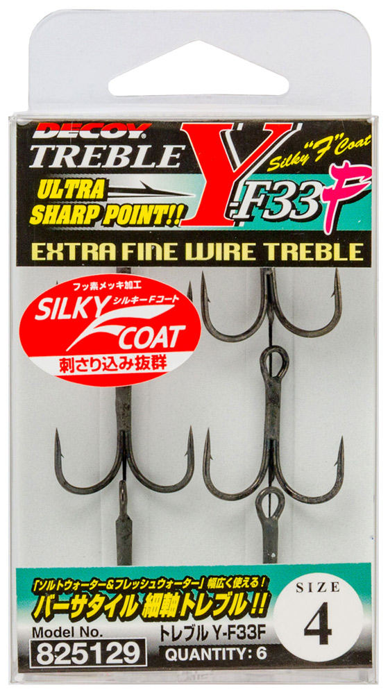 Тройник Decoy Y-F33F имеет классическую форму, подходящую для установки на воблеры, блёсны и силиконовые приманки. Его особенностью является тефлоновое покрытие, облегчающее проникновение жала в пасть рыбы, и уменьшающее блики. Высококачественная заточка и микробородка гарантируют удачную подсечку рыбы, при этом, исключая её внезапный сход. Широкий модельный ряд позволяет оснастить качественными тройниками приманку практически любого размера.