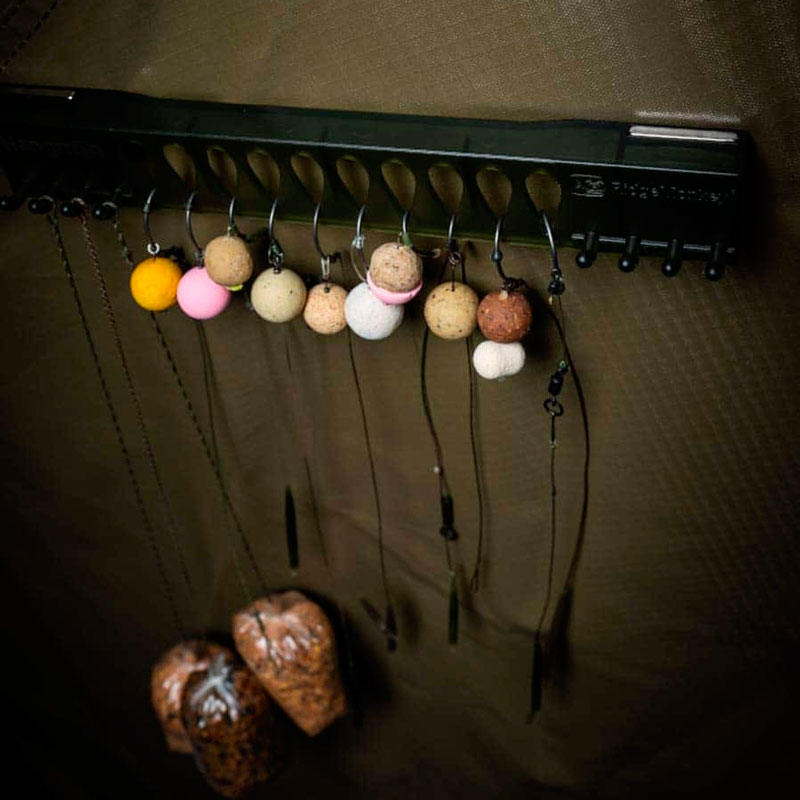 Специальные прорези и крючки позволяют вешать, как готовые поводки, так и оснастки с наполненными ПВА-пакетами - в общей сложности до 18 штук.